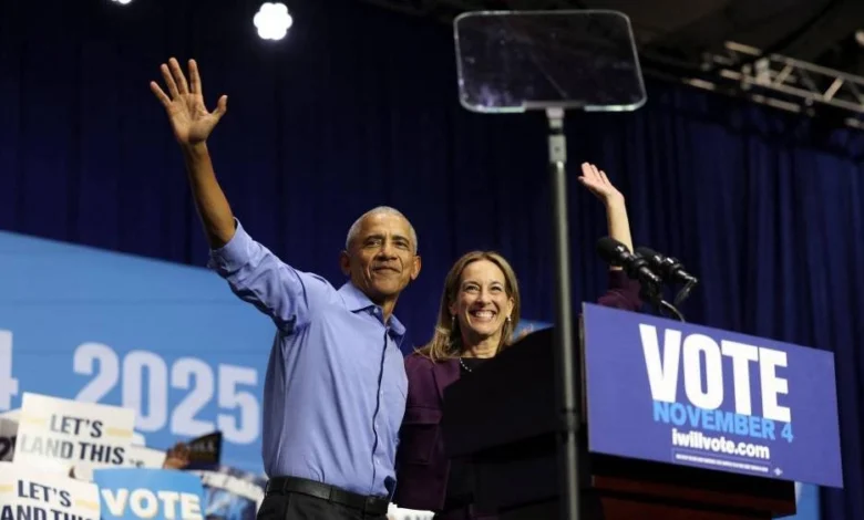 واعتلى أوباما، المنصة وسط تصفيق حار في فيرجينيا ثم في نيوجيرسي لدعم مرشحَين في انتخابات حاكمي الولايتين، والتي تُعتبر مؤشراً حاسماً قبل انتخابات التجديد النصفي لعام 2026.
