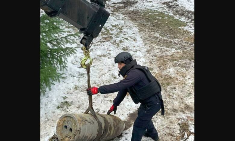 ونشرت هيئة الحالات الطارئة الأوكرانية عبر قناتها على «تلغرام» صورا تظهر رافعة تنتشل مخلفات صاروخ من الأرض.