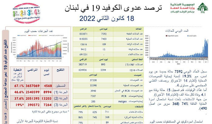 أعلنت وزارة الصحة العامة في تقريرها اليومي تسجيل ” 7592 إصابة جديدة بفيروس كورونا رفعت العدد التراكمي للحالات المثبتة الى 833871، كما تم تسجيل 15 حالة وفاة”.