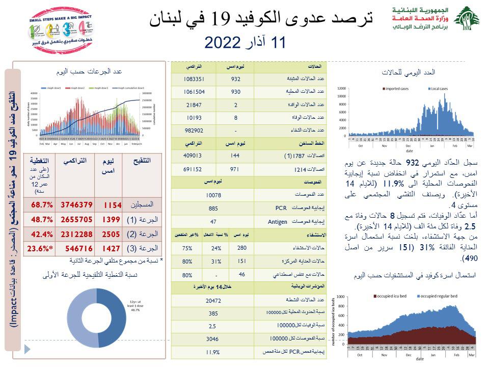 أعلنت وزارة الصحة العامة في تقريرها اليومي تسجيل 932 إصابة جديدة بفيروس كورونا رفعت العدد التراكمي للحالات المثبتة الى 1083351 ، كما تم تسجيل 8 حالات وفاة “.