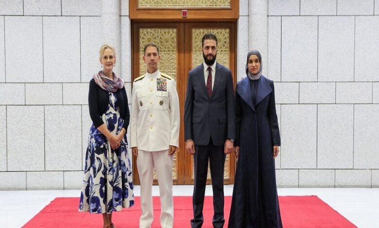 بحث الرئيس السوري أحمد الشرع مع الأدميرال تشارلز برادلي كوبر قائد القيادة المركزية الأمريكية آفاق التعاون في مختلف المجالات، بحضور عقيلتي الجانبين.