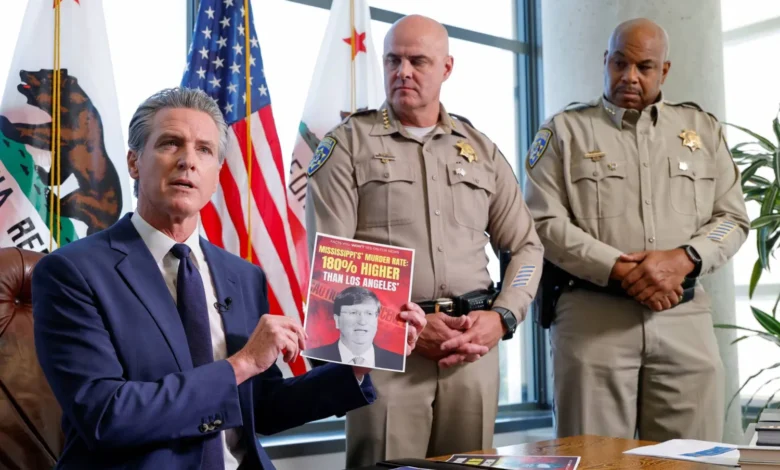 هاجم الحاكم الديمقراطي لولاية كاليفورنيا غافين نيوسوم جهود الرئيس الأميركي دونالد ترمب الرامية إلى «عسكرة» المدن في البلاد، حيث استعرض لافتات تقارن معدلات الجريمة في الولايات التي يقودها الجمهوريون بمعدلاتها في كاليفورنيا.